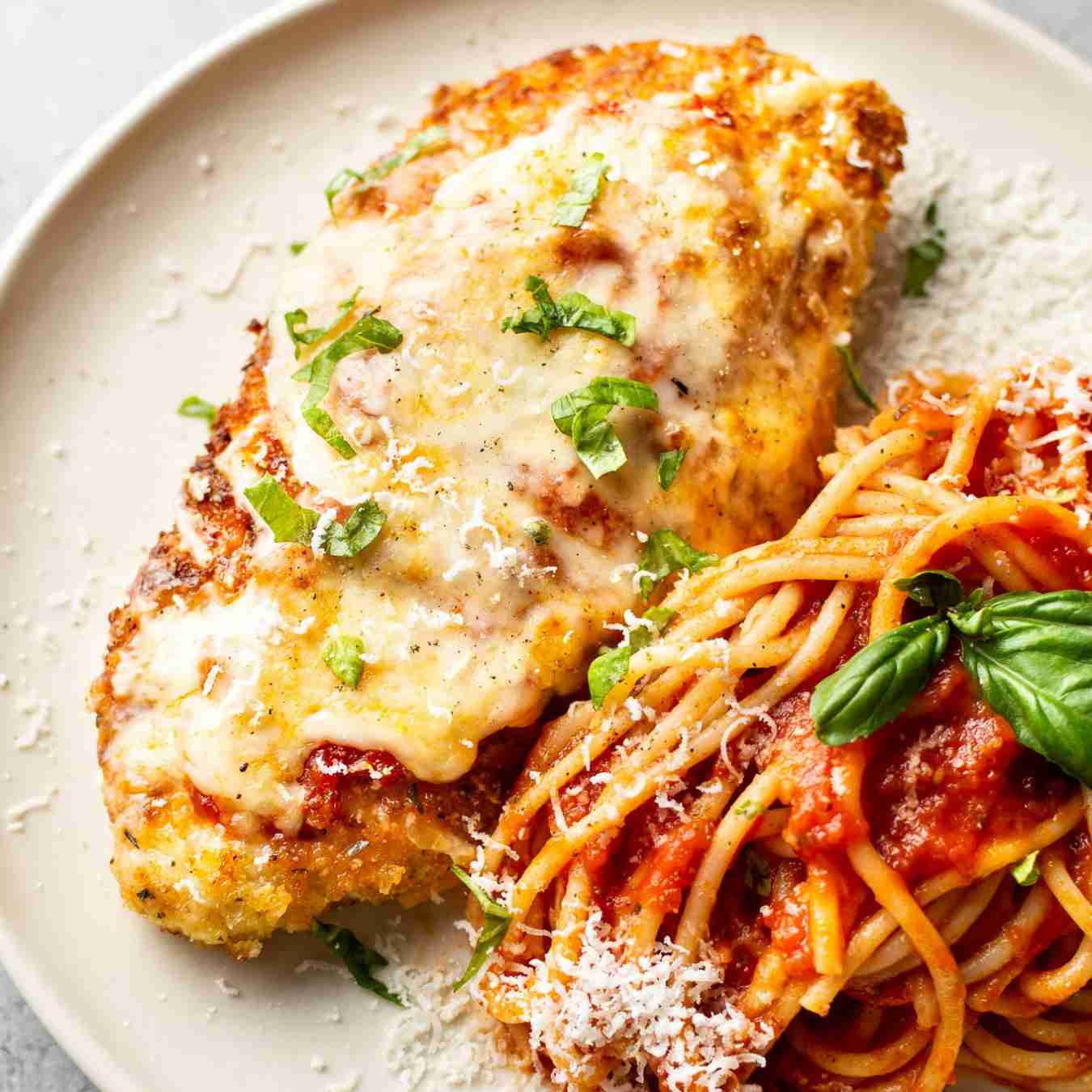 Rưới nước sốt thịt gà và phô mai lên mì Ý và thưởng thức