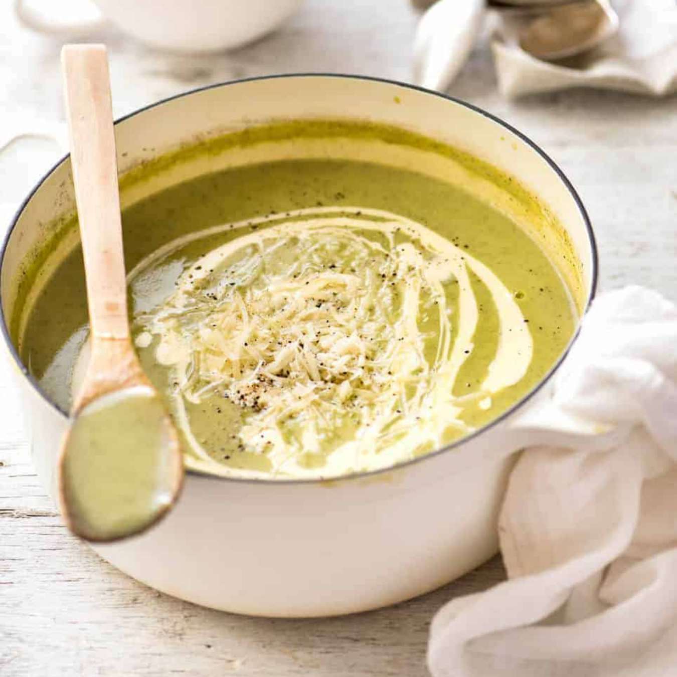 Đun nóng súp một lần nữa, cho Heavy cream vào, khuấy đều và đun nhỏ lửa