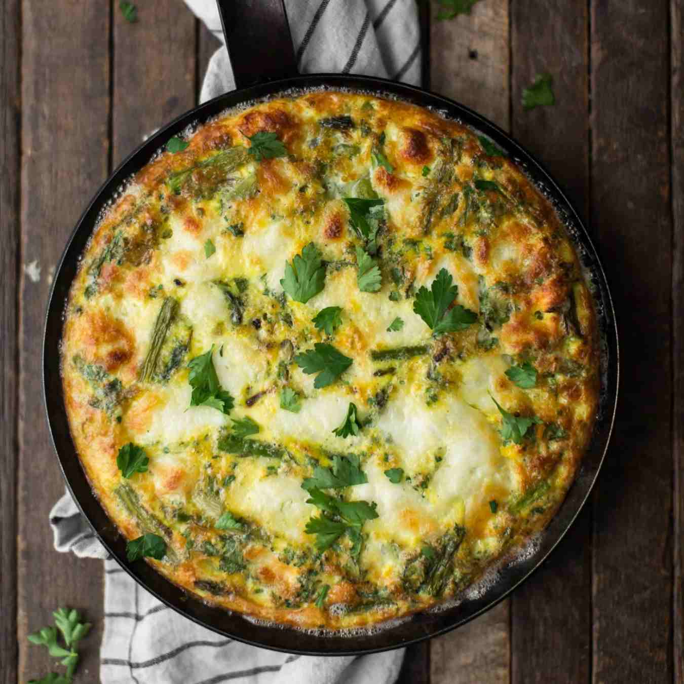 Thêm măng tây vào, đảo đều và nấu trong 6 phút. Đập trứng vào trộn đều và nấu trong 3 phút
